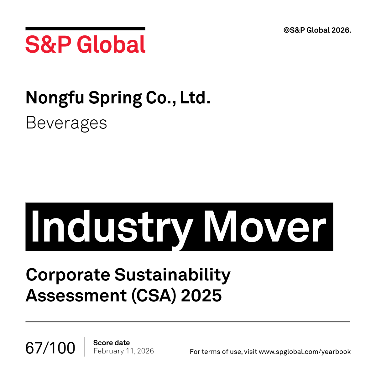 2月18日,标普全球(S&P Global)正式发布2026年《可持续发展年鉴》(下称“全球版《年鉴》”),农夫山泉凭借在环境、社会及公司治理(ESG)方面的优秀表现入选,位列全球饮料行业第十名并荣膺“行业最佳进步企业”称号。此前,农夫山泉已连续三年入选标普全球《可持续发展年鉴(中国版)》。