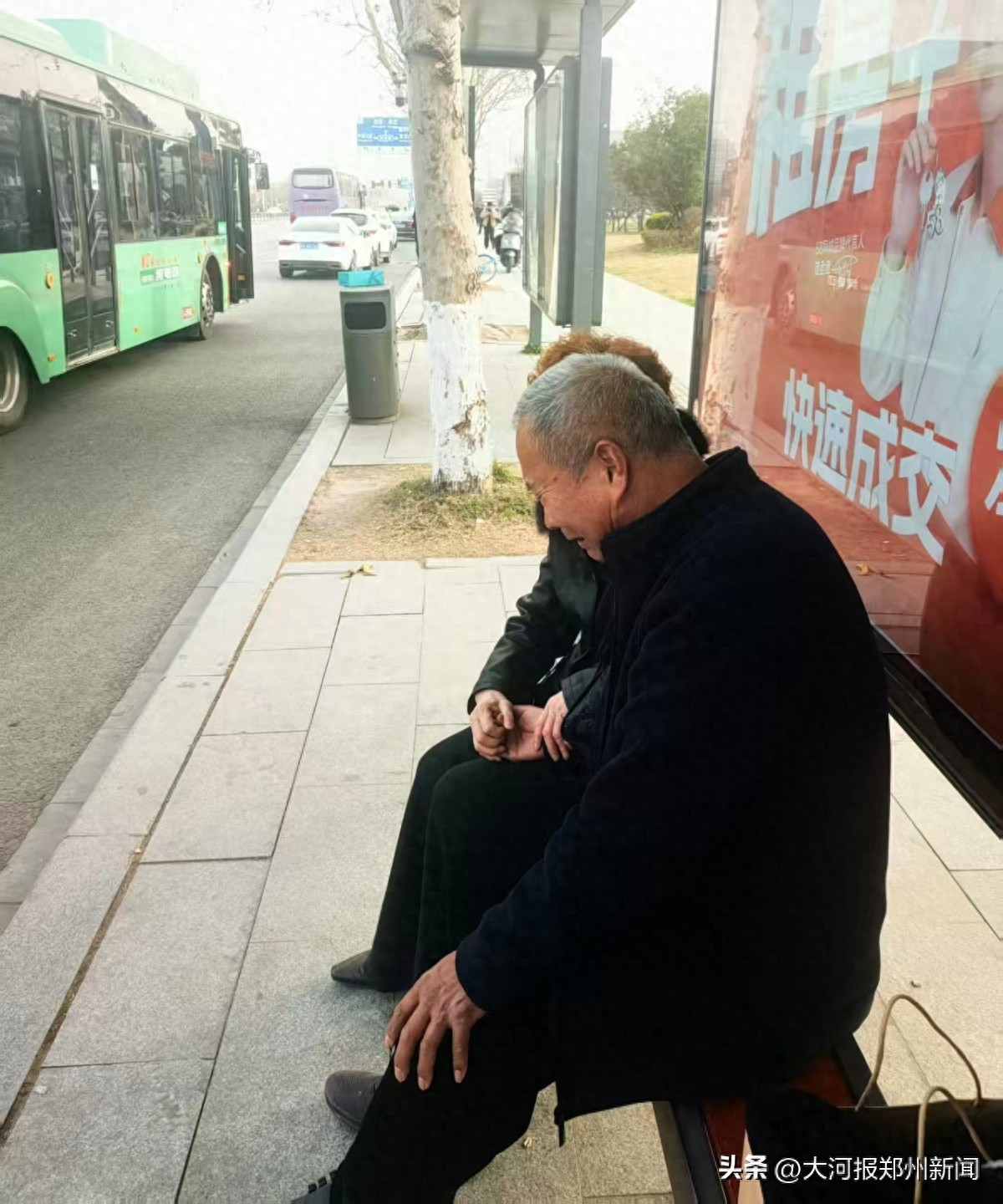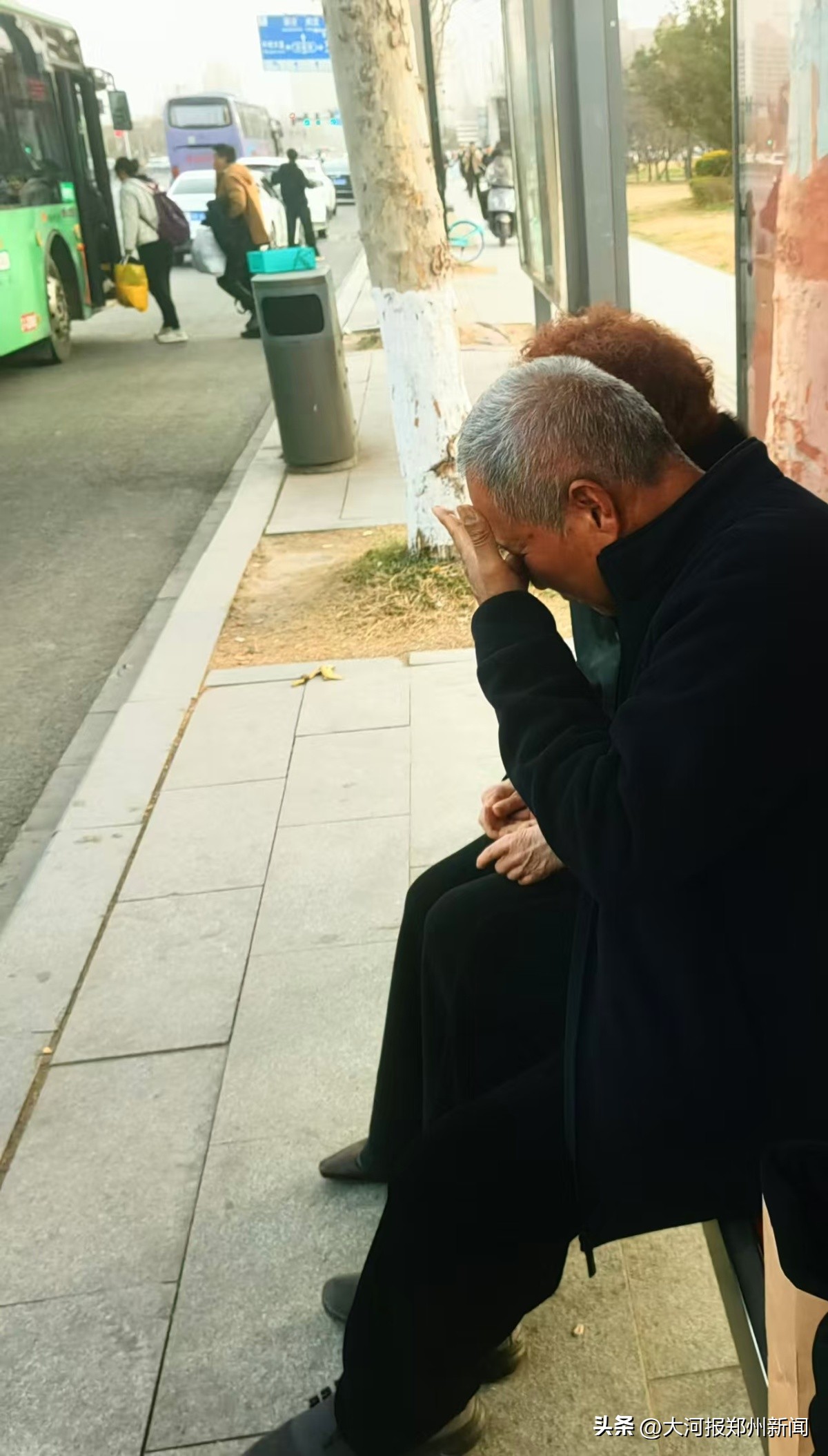 当天傍晚5点多,河南日报社视觉全媒体中心•大河报记者走到花园路郑州长途汽车北站路西一公交站牌时看到,一位头发花白的老先生在一位老太太的陪同下,坐在那里,四处张望,泪流满脸。老太太不停安慰,老先生却难掩情绪,痛哭起来。
