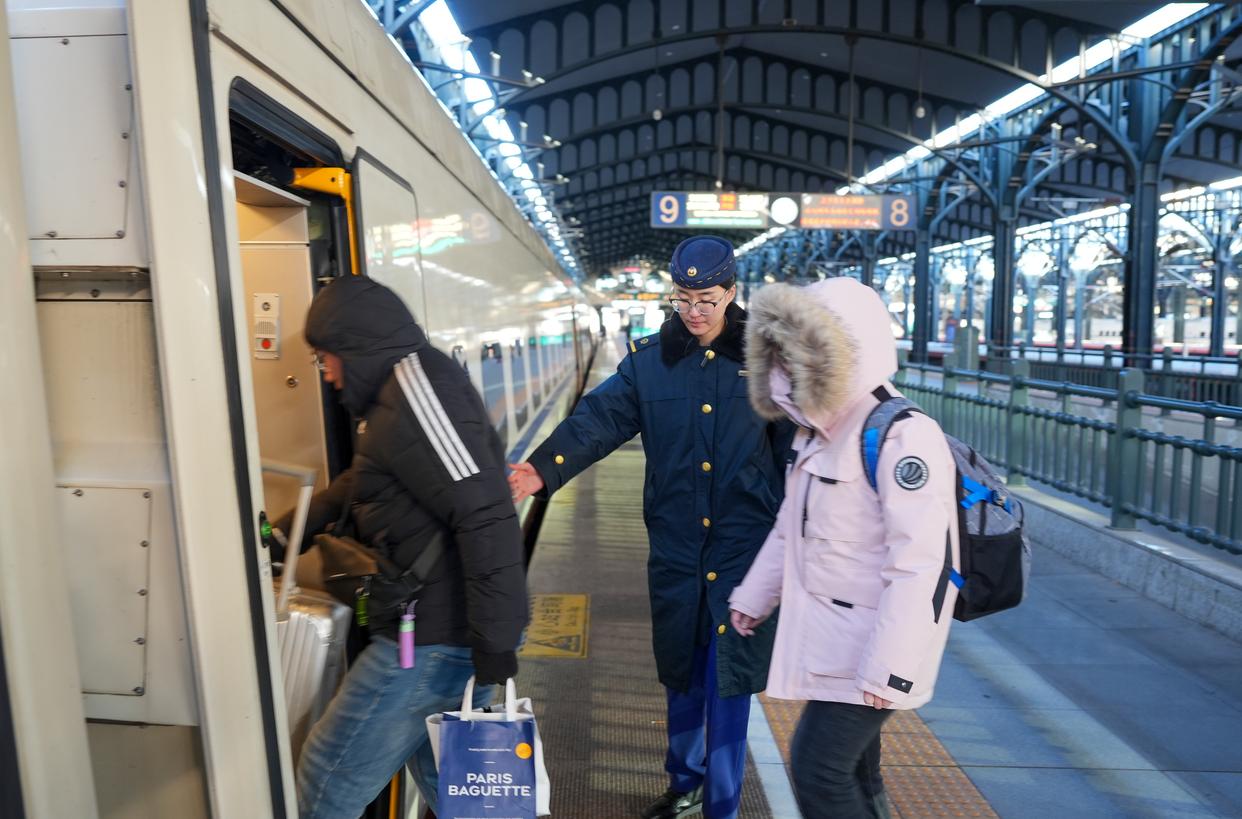 中国铁路哈尔滨局集团有限公司工作人员(中)在哈尔滨火车站为旅客服务。李昕洋 摄