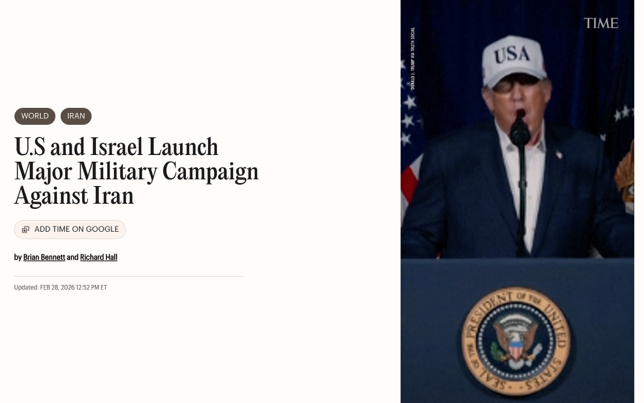 △《时代》周刊报道,特朗普对该媒体表示,毫无疑问,这次的军事打击是一场政权更迭战争