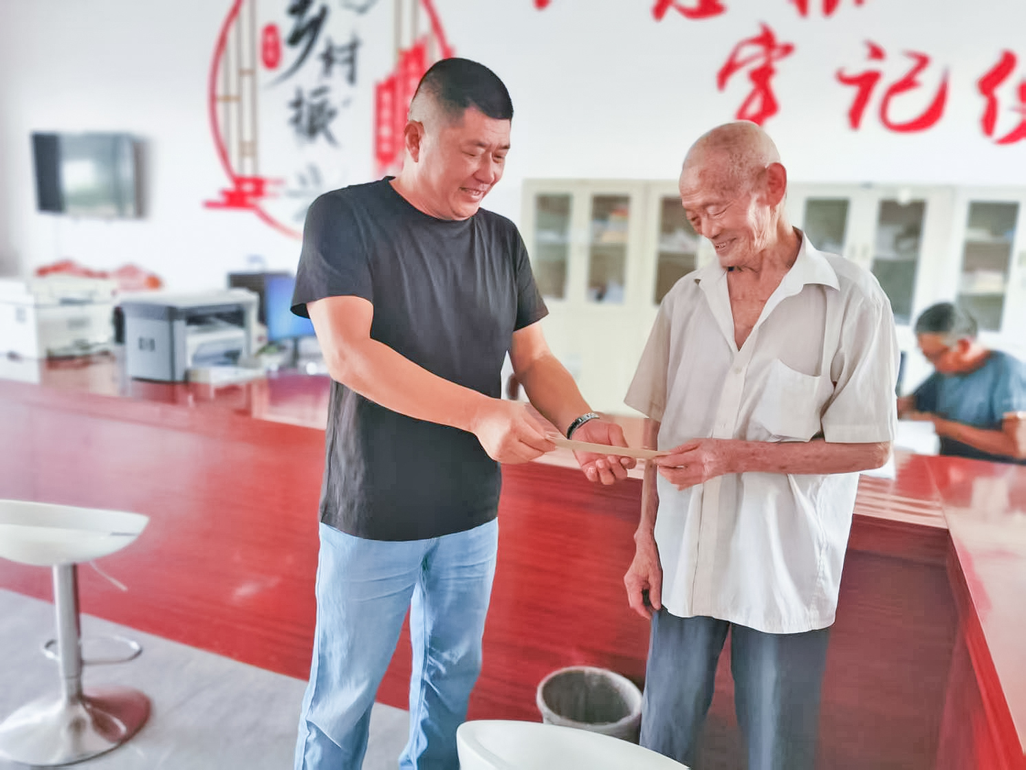 吴劲松在重阳百叟宴上带领村“两委”向老人送祝福。(通讯员供图)