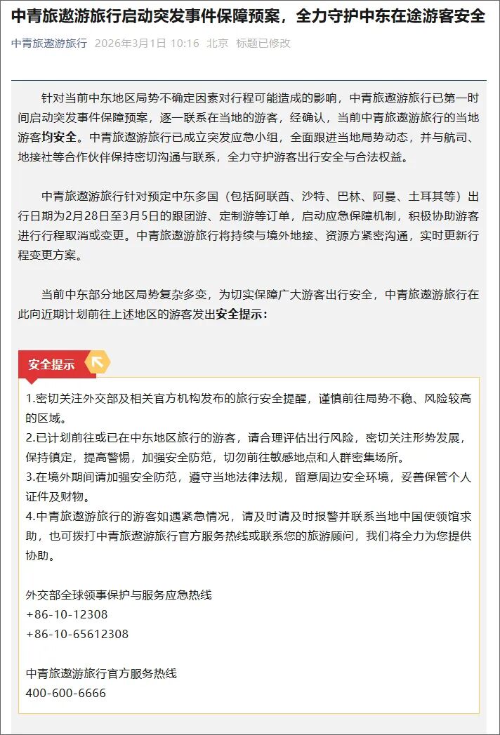多家旅游企业表示,将持续密切关注中东局势发展,及时更新保障政策,全力守护游客出行安全与合法权益。
