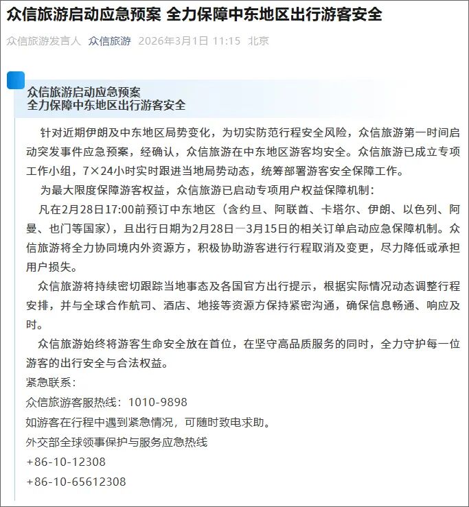 众信旅游表示,凡在2月28日17:00前预订中东地区(含约旦、阿联酋、卡塔尔、伊朗、以色列、阿曼、也门等国家),且出行日期为2月28日至3月15日的相关订单启动应急保障机制。全力协同境内外资源方,积极协助游客进行行程取消及变更,尽力降低或承担用户损失。