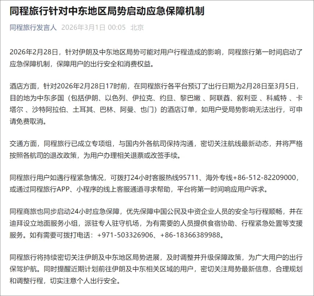 2月28日,针对伊朗及中东地区局势可能对用户行程造成的影响,同程旅行第一时间启动了应急保障机制,保障用户的出行安全和消费权益。