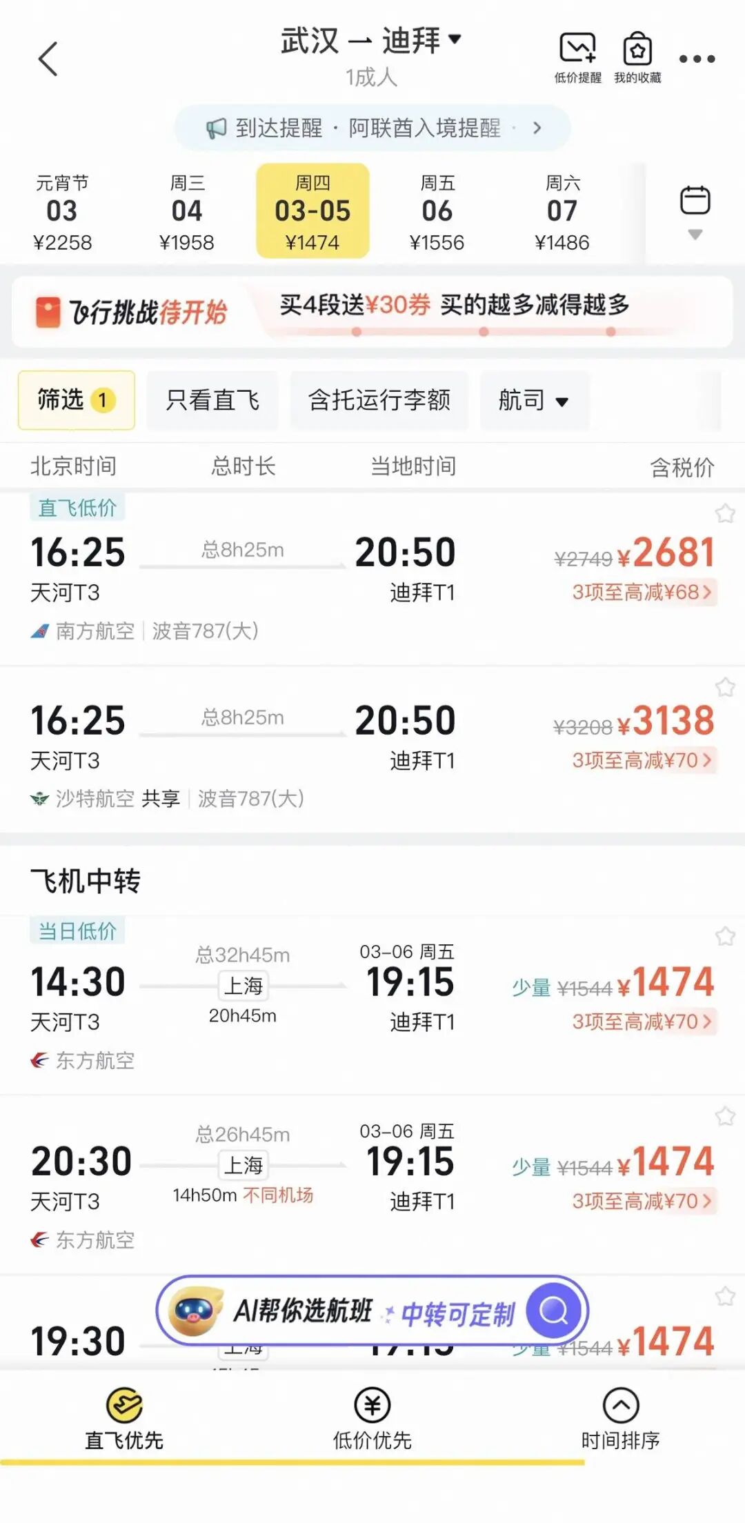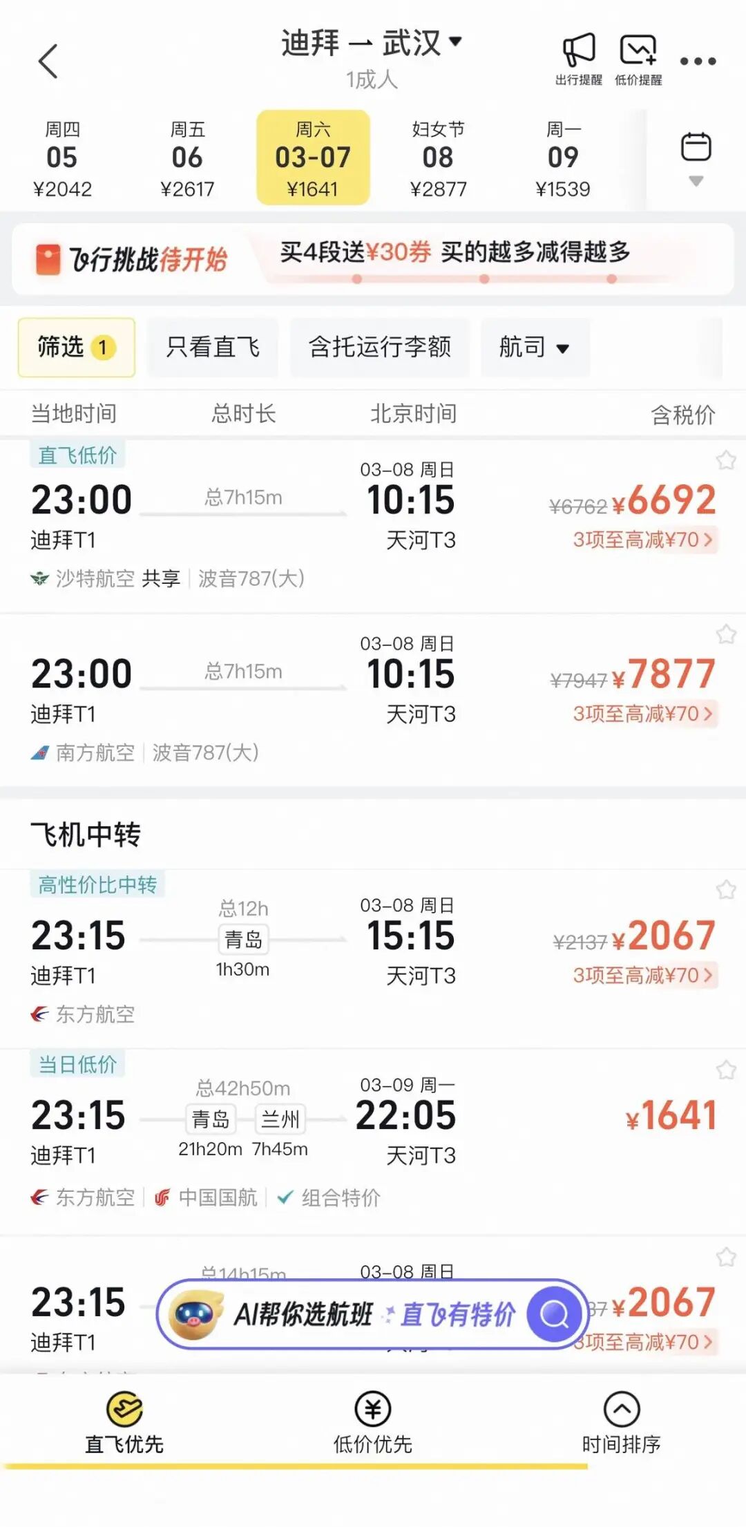 目前迪拜至武汉直飞航班最早可购日期为3月7日。