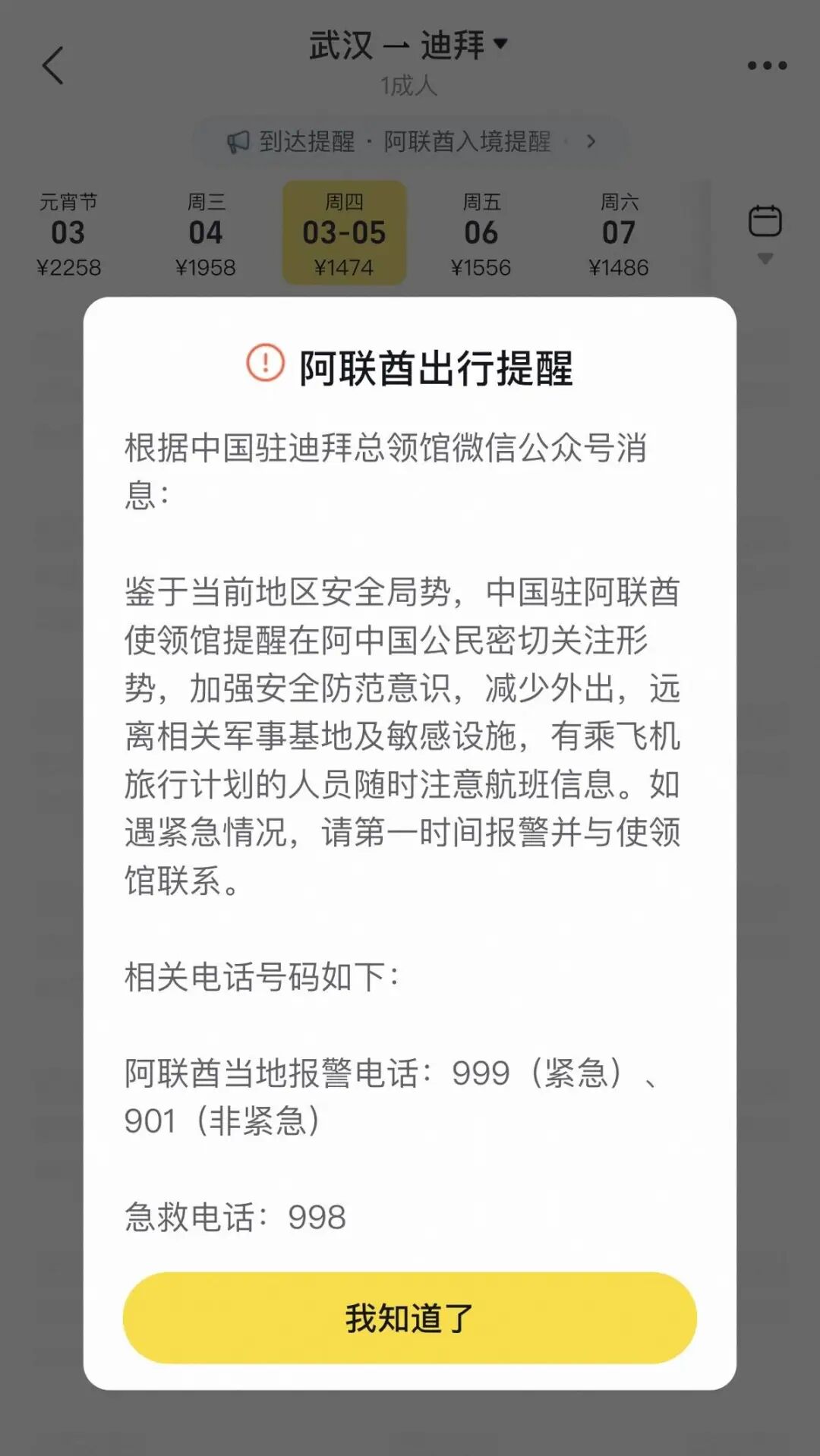 旅客打开出行APP查询武汉至迪拜航班信息时,会弹出出行提醒。