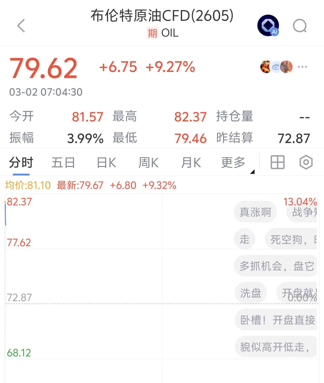 油价方面,布伦特原油开盘暴涨13%,至每桶82美元,截至发稿涨9.27%报79.62美元/桶。WTI原油跃升至75.33美元/桶。