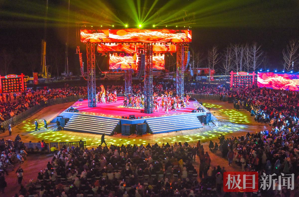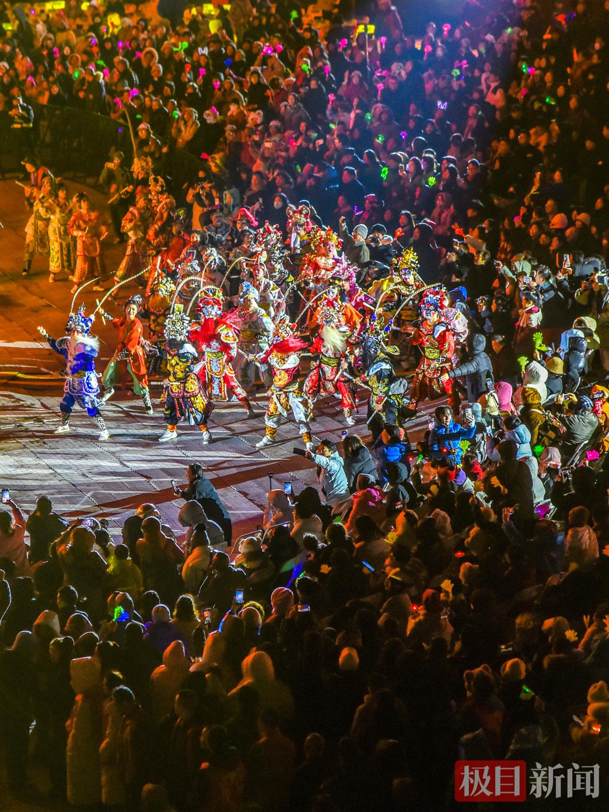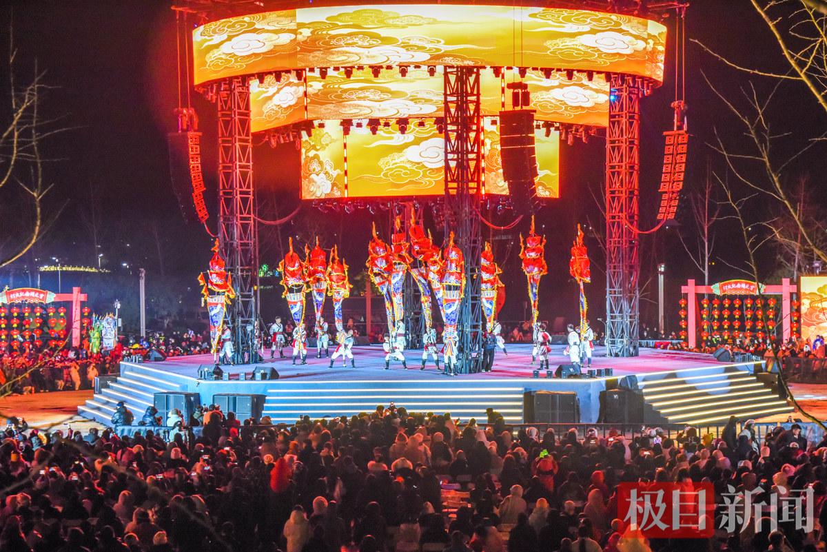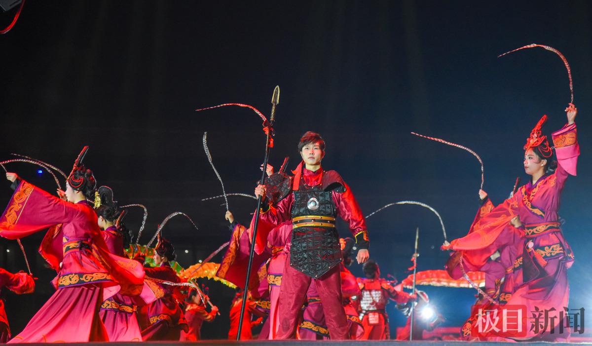 极目新闻记者现场看到,来自山东德州的国家级非遗项目中幡,其代表性传承人操控着9米高的中幡,完成高难度杂技动作,赢得现场观众欢呼喝彩。