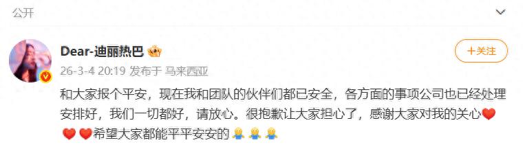 3月4日晚,演员迪丽热巴微博发文报平安:“现在我和团队的伙伴们都已安全,各方面的事项公司也已经处理安排好,我们一切都好,请放心。”该条博文IP地址显示是在马来西亚。