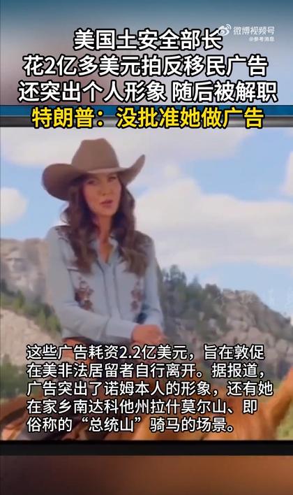 美国国土安全部长克丽丝蒂·诺姆斥巨资做反移民广告令她成为众矢之的。美国总统特朗普3月5日说,他没有批准做广告一事,随即宣布诺姆将改任其他职务。这些广告耗资2.2亿美元,旨在敦促在美非法居留者自行离开。据报道,广告突出了诺姆本人的形象,还有她在家乡南达科他州拉什莫尔山、即俗称的“总统山”骑马的场景。