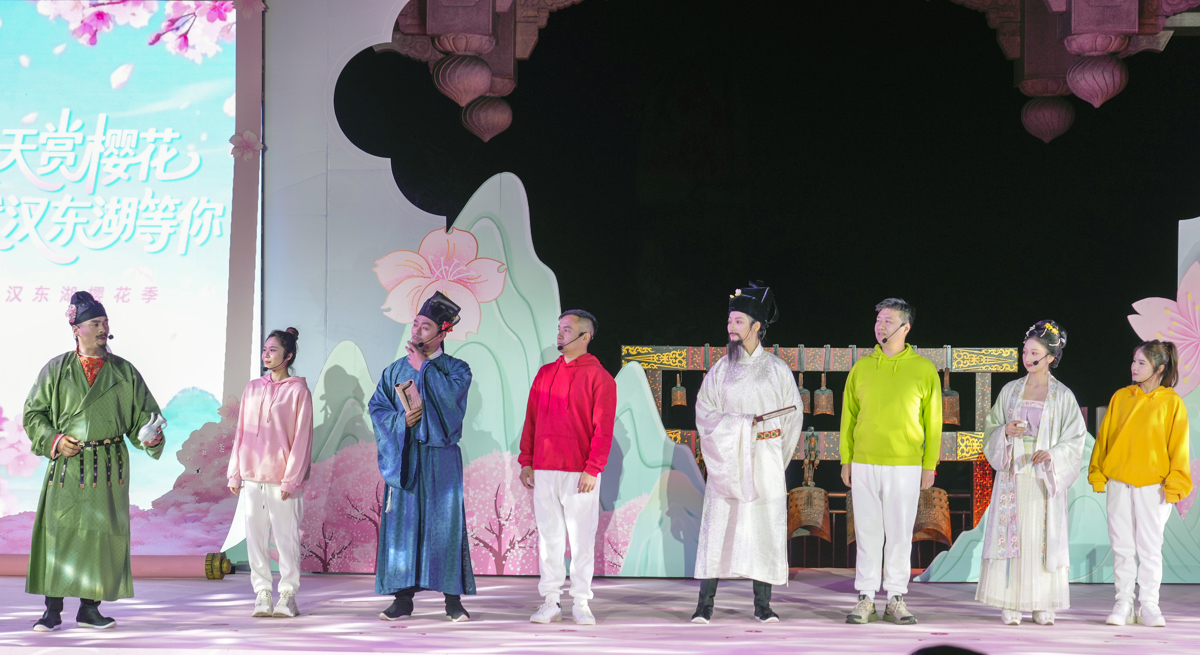风和樱艳,樱花园的多处点位藏着不期而遇的惊喜。沉浸式歌舞在花影间悄然开场,衣袂翩跹与粉白花瓣共舞,将春日浪漫演绎到极致;湖心岛上,器乐声袅袅升起,营造出“人在舟中奏,乐随水波流”的诗意意境。“凤舞九天,福泽八方”的演艺从湖心岛处翩然“起飞”,羽翼掠过粉樱枝头,裹挟着花香漫向四方,为春日盛景平添几分灵动祥瑞。从曲院樱艳到华莲池,多个特色点位串联起一场流动的演艺盛宴,让游人在赏樱之余,沉浸式感受歌舞、器乐与灵韵景致交织的雅韵,步步皆风景,时时有惊喜。