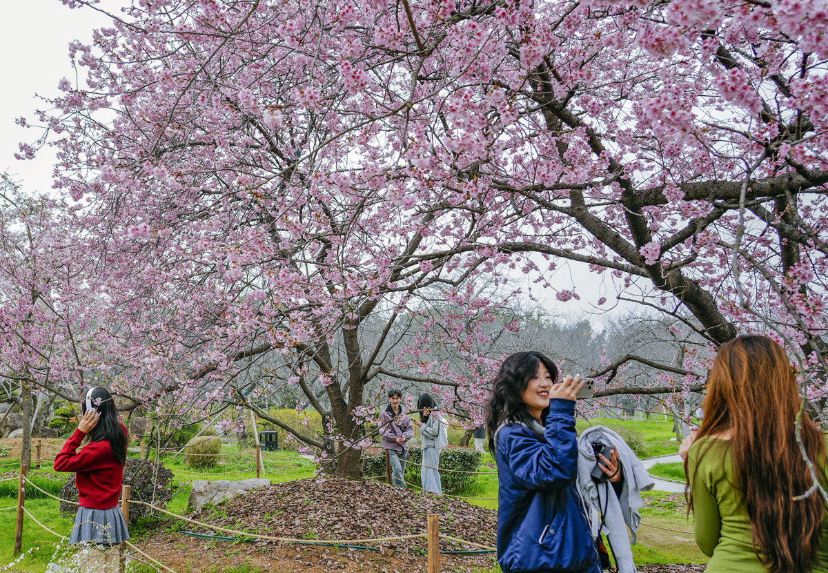 讲好中国故事,弘扬文化自信。樱花种植自唐代盛行向世界传播,目前全球种植樱花的国家和地区超过60个。东湖樱园今年新引中国樱花,为春日晕染开浓郁的华夏风情。早樱吐蕊如霞似雪,凝露含香;晚樱叠瓣若云似锦,艳而不俗,各品种樱树风姿各异,尽显中国樱的清雅风骨与独特韵味。专属打造的中国樱古诗词道贯穿中国樱的核心区域点,青石板路面之上,历代咏樱诗篇以雅致字体镌刻或铺陈,与道路两侧的中国樱枝桠相映成趣,营造出“花铺春路艳,诗嵌石径香”的诗意。漫步其间,脚下是墨韵留香的诗句,身旁是粉白相间的樱朵,春风拂过,花瓣轻落沾衣,耳畔似有古人咏春的清吟回响,每一步都踏在诗与画的交汇处。从品种展示区到园区深处,游人赏樱途中学诗、品诗,沉浸式感受中华文脉与自然春光的深度交融,步步皆风雅,景景藏底蕴。