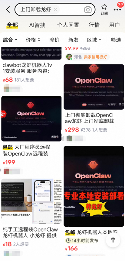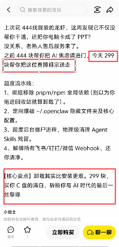 最初,不少新手怀着“AI打工”的美好憧憬入坑,可在实操后才发现,“小龙虾”并没有带来“躺着赚钱”的生活。不断产生的算力消耗账单、个人信息被窃的焦虑,让一些用户选择卸载OpenClaw。于是,“上门卸载OpenClaw”的服务在电商平台诞生,甚至不少商家同时提供安装和卸载的服务。