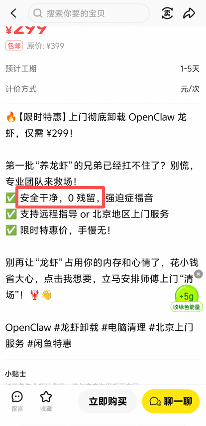 现代快报讯(记者是钟寅)近日,开源AI智能体“小龙虾”OpenClaw持续火爆。因其高执行权限的特点,被曝出存在信息安全隐患。于是,“卸载龙虾”又成了AI新手的刚需,在电商平台上有人推出299元“上门卸载OpenClaw”的服务,号称可以“0残留”“永绝后患”,事实真的如此吗?