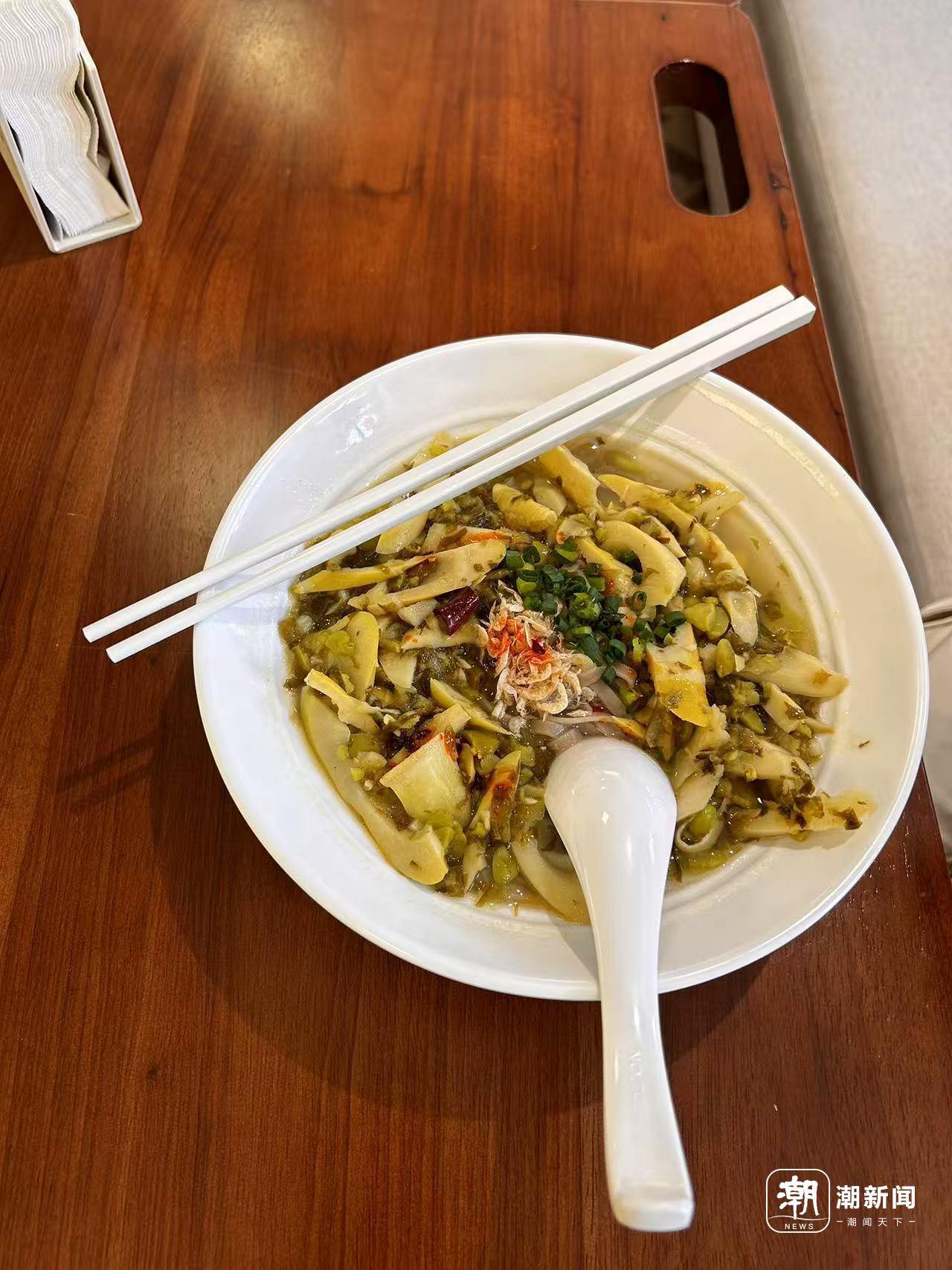 我和同事索性下单了两碗,总24元,确实是便宜。我点了黄精面,快是真快,两三分钟,面就端上桌了。整体来说,汤头是很清淡的,我觉得蛮好,浇头是师傅提前炒好的,只有两样。同事也评价,称不上惊艳但尚可口。像我们碰到的泰国女生,就把一大碗面吃光了,一根笋丝也不剩,几乎不吝溢美之词。