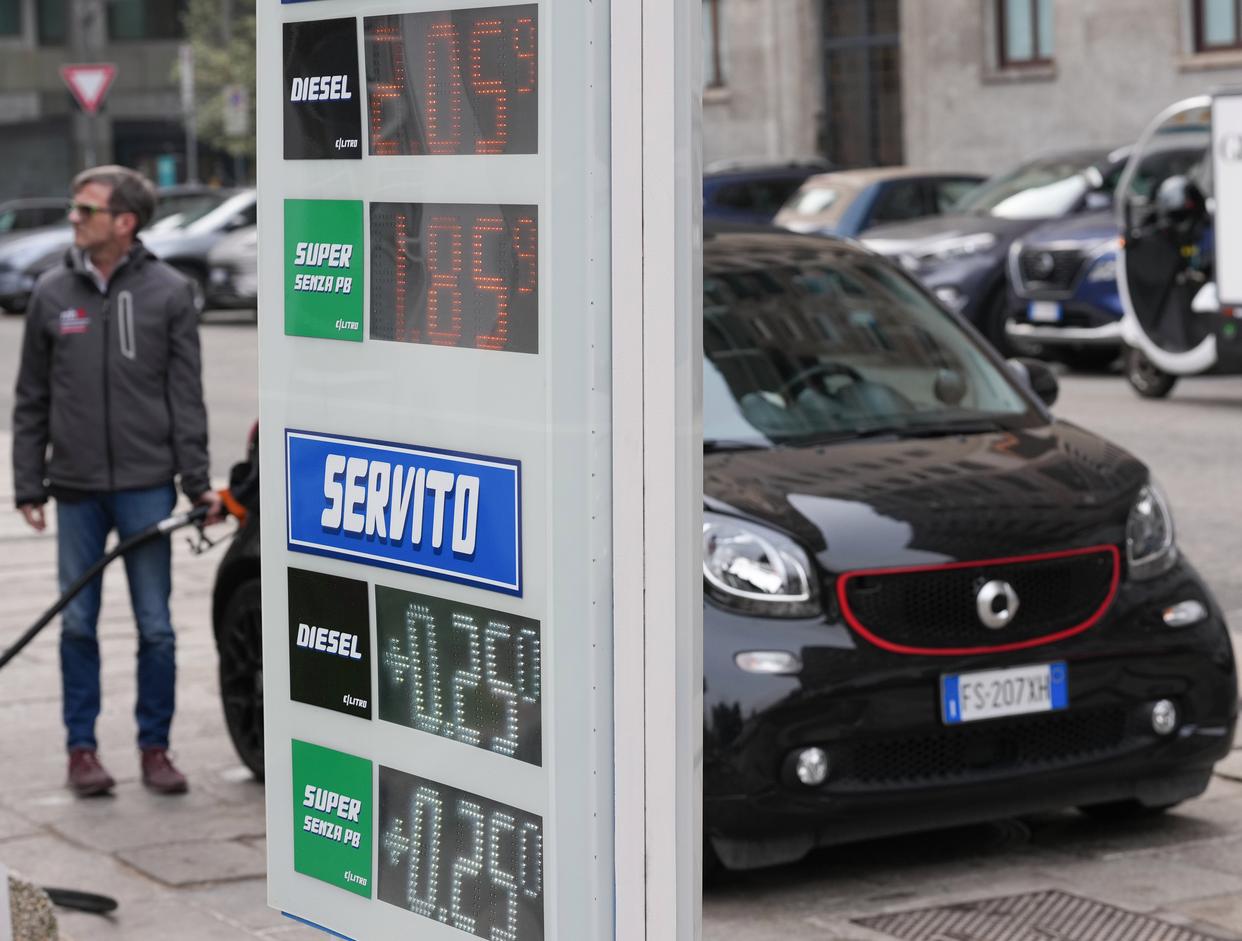 3月11日,在意大利米兰,市民在市中心一家加油站加油。新华社记者 李京 摄