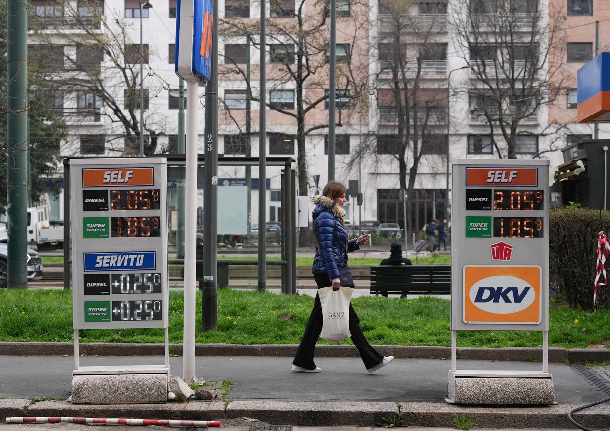 3月11日,在意大利米兰,市民经过市中心一家加油站。新华社记者 李京 摄