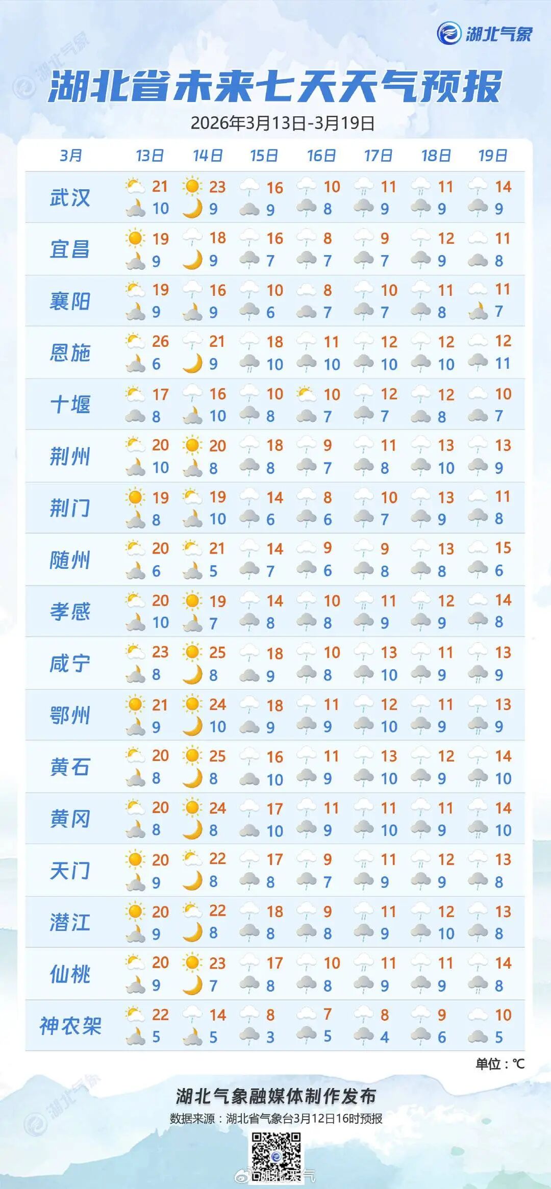 请公众抓紧明天晴好天气洗衣晾晒,出游赏花。双休日冷空气来袭,降雨又降温,其中鄂西北高海拔地区有雨夹雪或雪,公众需合理安排出行计划,防范路面湿滑、结冰给交通带来的不利影响。