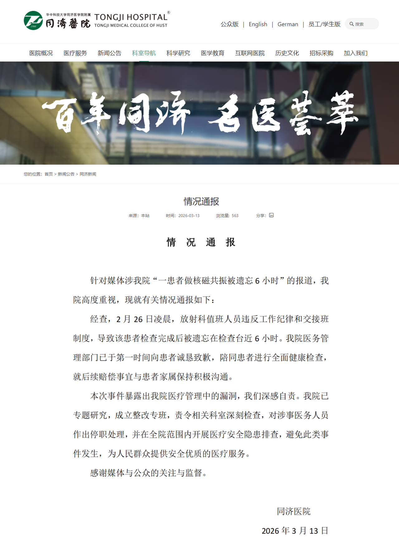 3月13日,华中科技大学同济医学院附属同济医院发布通报: