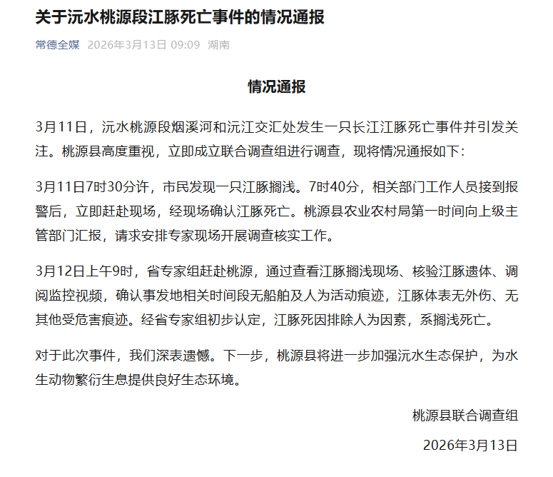 3月11日,湖南常德沅水桃源段发现一头长江江豚死亡,此事在当地引发关注。此前该水域刚被报道本世纪首次出现长江江豚,被视为生态改善的重要标志。经湖南省专家组调查确认,江豚体表无外伤、事发水域无船舶及人为活动痕迹,初步排除人为因素,认定为搁浅死亡。当地已成立联合调查组,并表示将进一步加强水域生态保护。