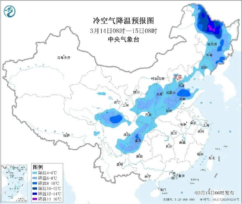 今天(3月14日),降雪范围进一步向东推进。明天北方雨雪会告一段落,降水重心将转移至西南地区东部到长江中下游一带,在冷空气和阴雨天气影响下,部分地区会出现剧烈降温,局地降幅可达10℃以上。