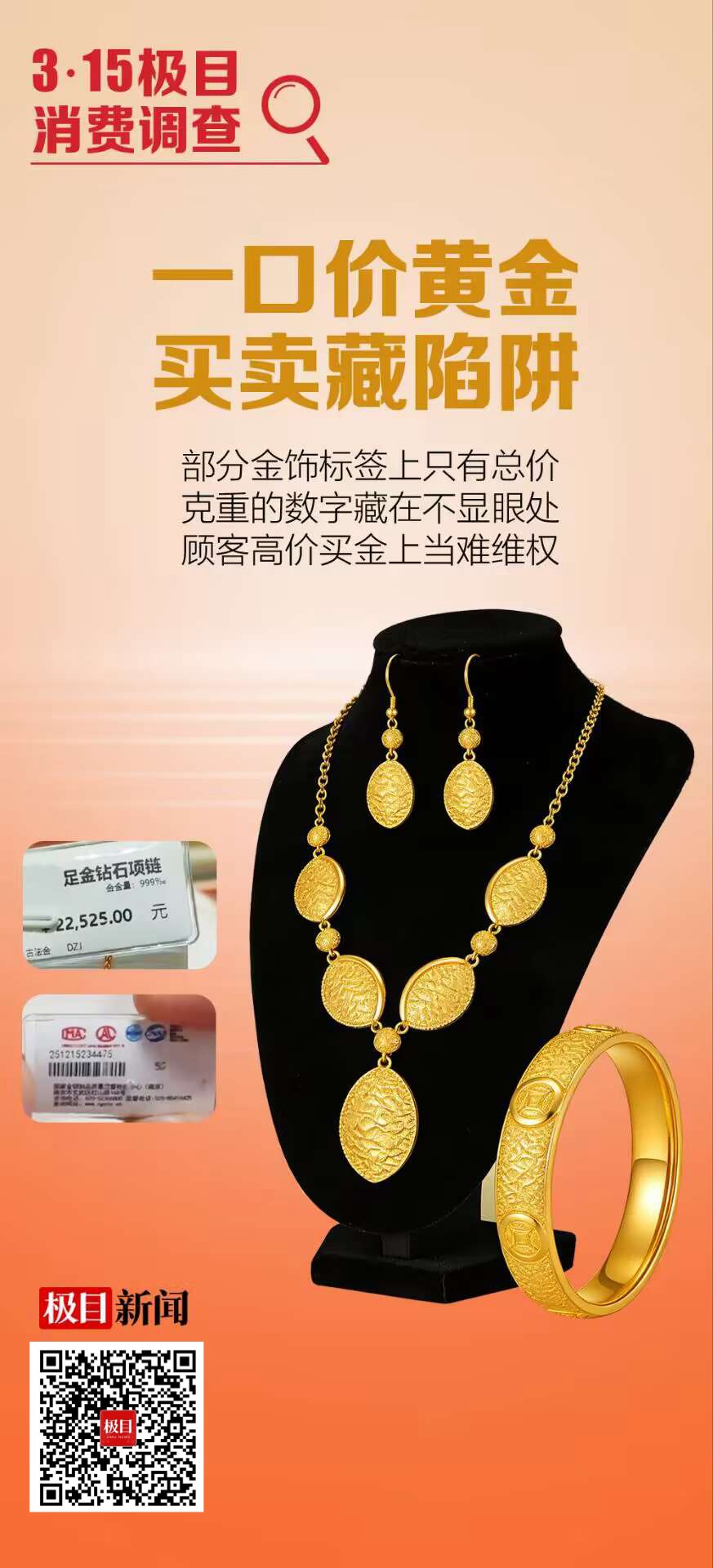 2026年“3·15”国际消费者权益日到来之际,极目新闻记者采访发现,部分商家卖“一口价”金饰的套路较为相似:在标签上用很小的字注明克重,然后将标签折叠套起,这样会让一些粗心的顾客注意不到这个数字。当顾客问起克重时,商家会以各种方式搪塞。