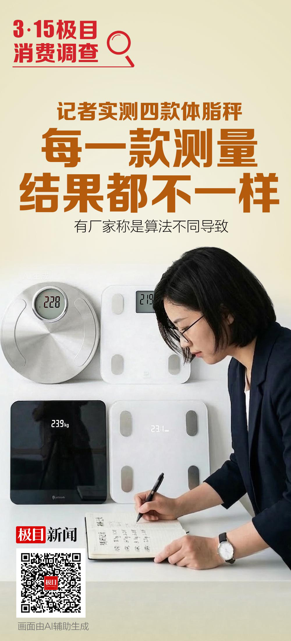 3月3日下午3时许,极目新闻两名记者先来到武汉市一家三级甲等医院进行体脂检测。第一名记者的体重为80.2公斤,体脂率为30.3%;第二名记者体重为64.8公斤,体脂率为19.7%。当日下午4时许,记者对随机网购四款体脂秤进行实测。