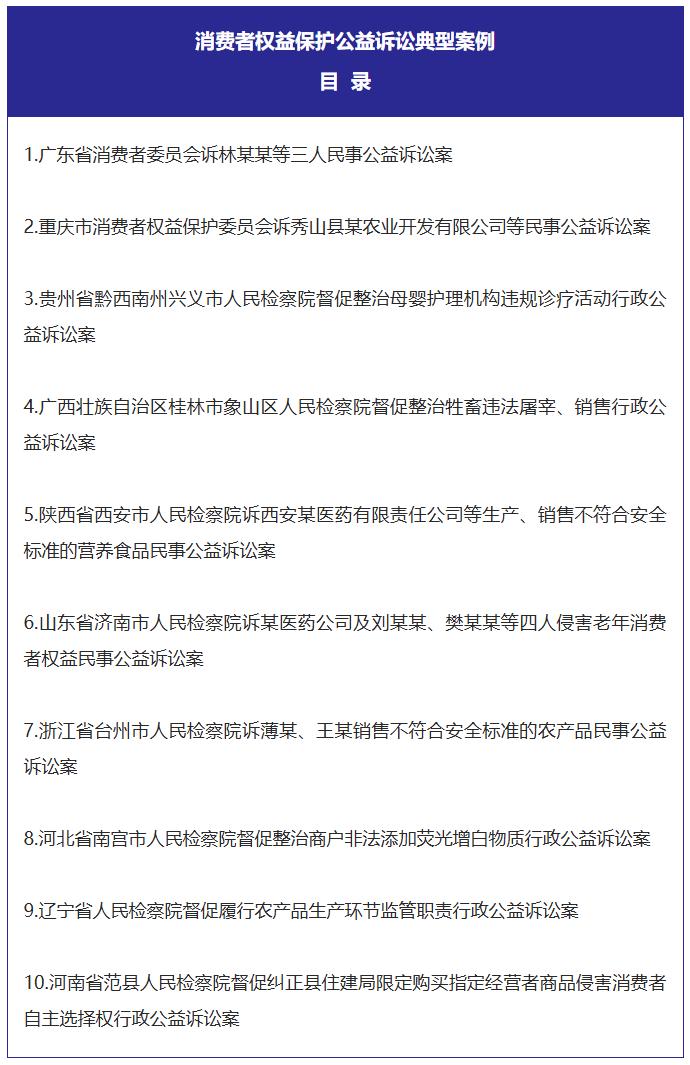 最高人民检察院、中国消费者协会3月15日发布一批消费者权益保护公益诉讼典型案例。这批典型案例共10件,涉及营养品、农产品等多个消费品类别。