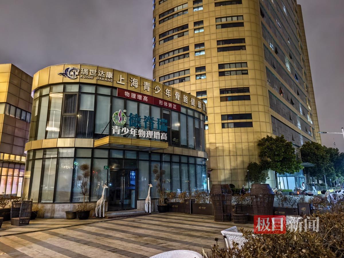 3月15日晚10时许,极目新闻记者来到位于上海浦东新区三林镇长清路的一家德脊瑞门店。记者注意到,该门店所在独栋建筑外墙挂着“瑞世达康”“物理增高,形体矫正”的标识,外墙宣传海报宣称:“物理增高、形体调整,高效、科学、安全、无副作用。”
