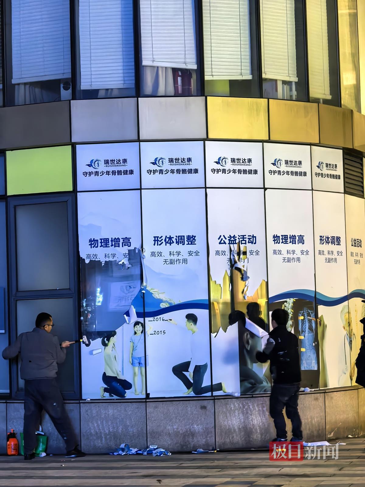 3月15日晚,央视3·15晚会曝光了部分机构宣传能给孩子增高的骗局,报道中涉及安立身、德脊瑞等门店。当晚,极目新闻记者来到位于上海浦东的一家德脊瑞门店,几名工作人员正在拆除该门店外墙贴的宣传海报。
