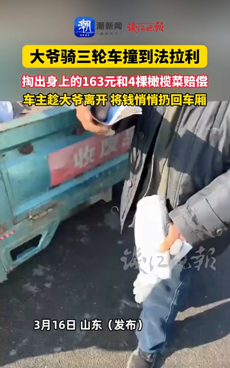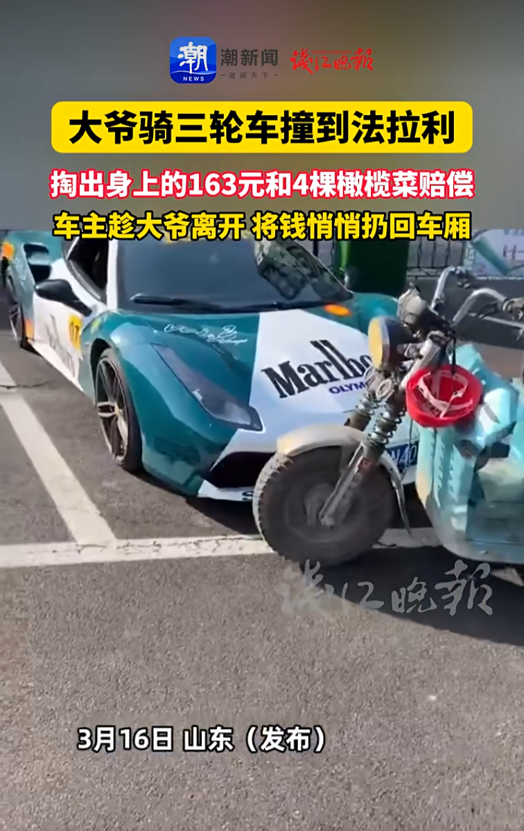 山东一大爷骑三轮撞上法拉利,拿出身上全部的163元和4颗橄榄菜赔偿,车主趁大爷离开时将钱悄悄放回