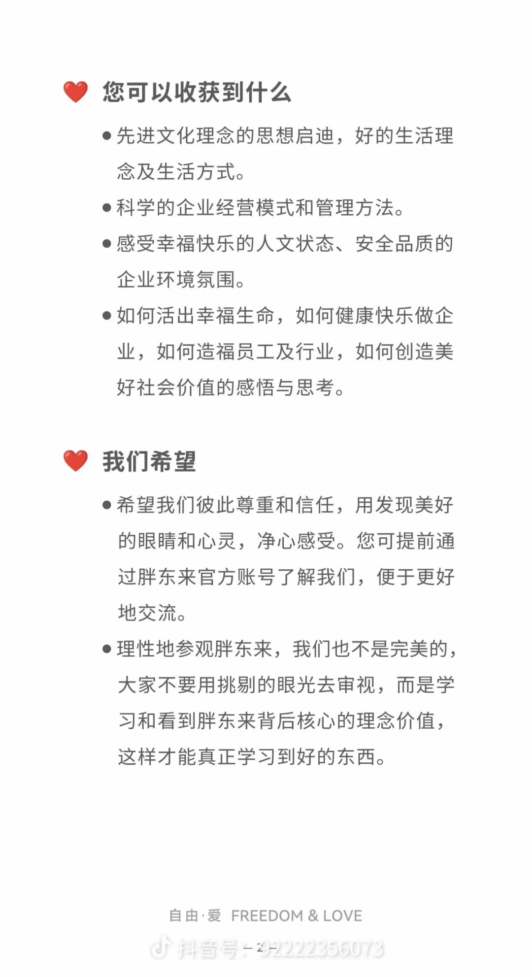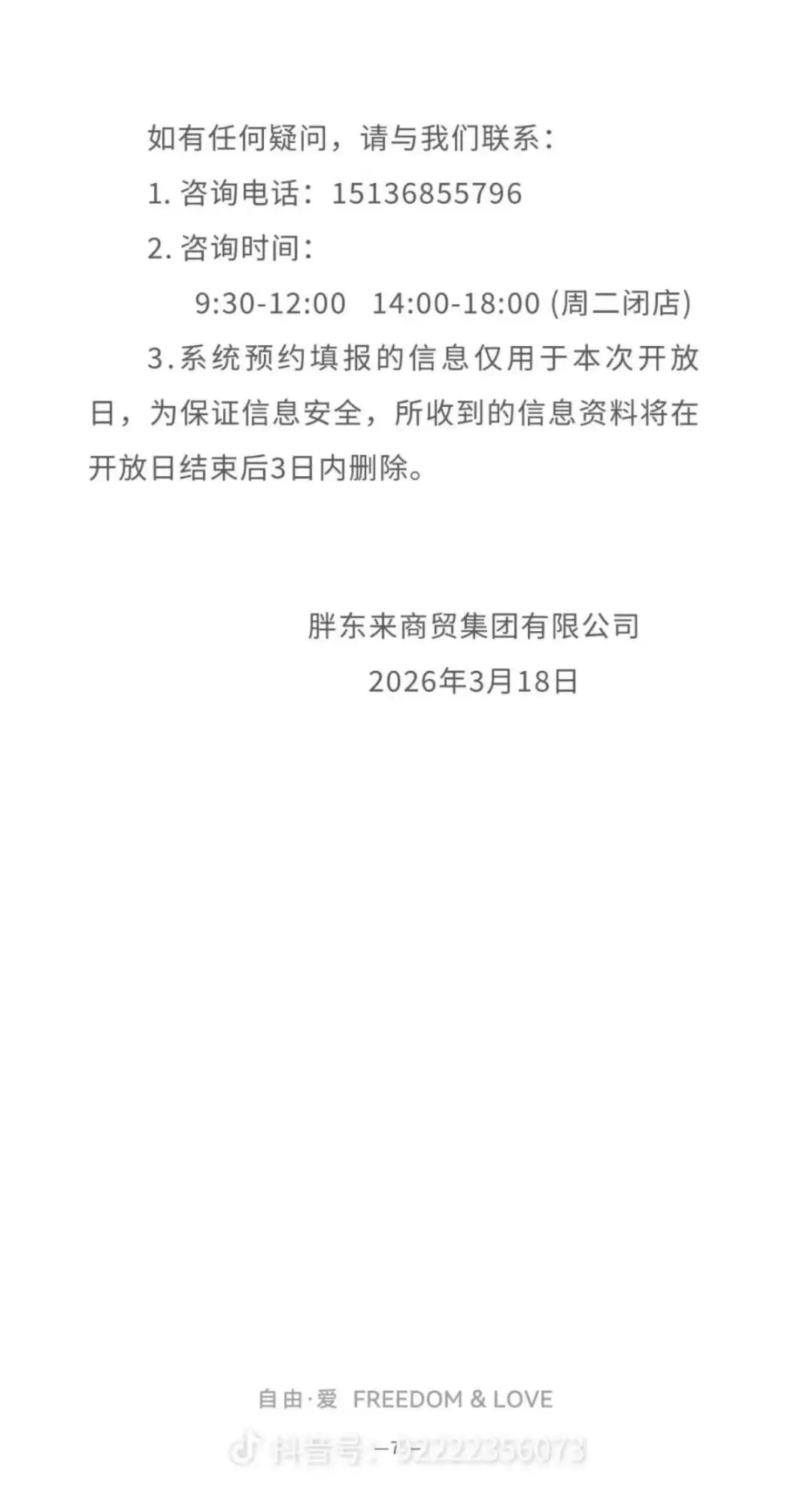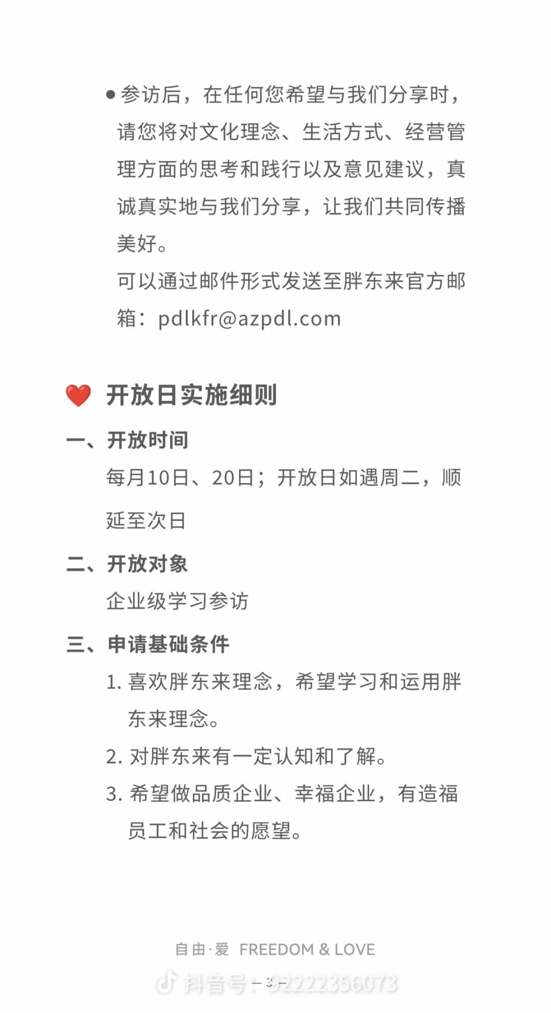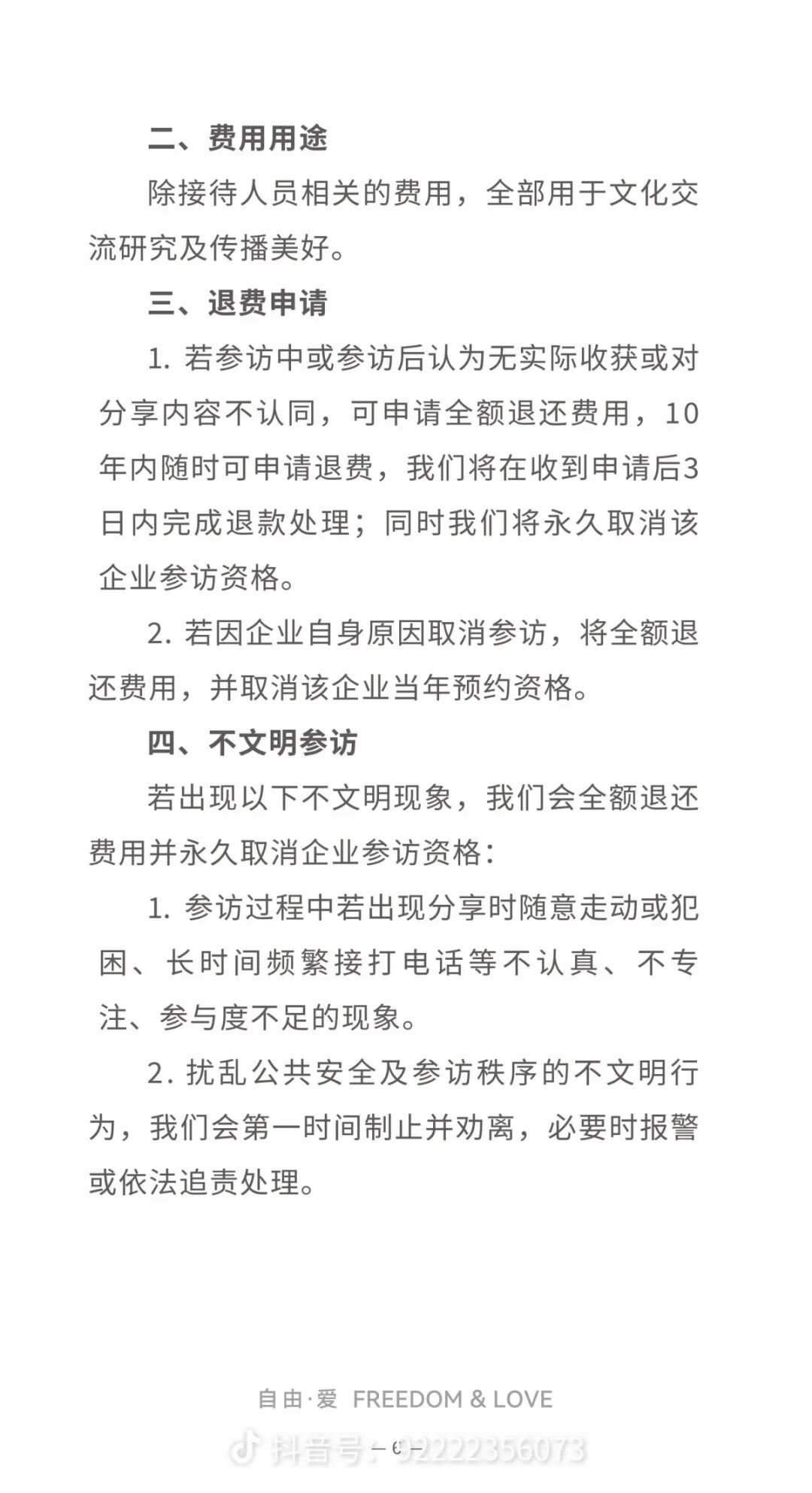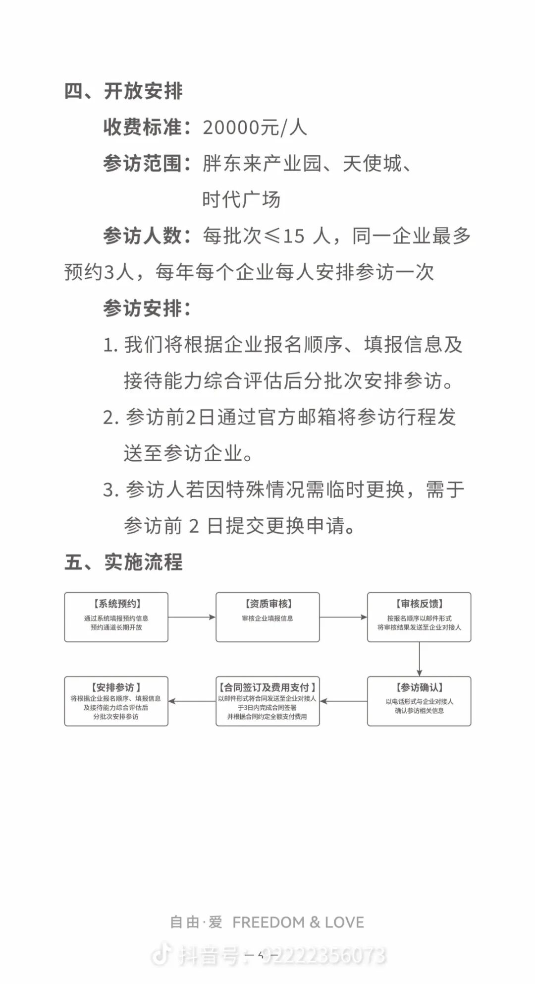 至于费用的用途,据官方称,“除接待人员相关的费用,全部用于文化交流研究及传播美好。”此外,据官方称,开放对象为企业级学习参访,参访人数为每批次≤15人,同一企业最多预约3人,每年每个企业每人安排参访一次。开放时间为每月10日、20日,如遇周二,顺延至次日。参访人员的参访范围为胖东来产业园、天使城、时代广场。