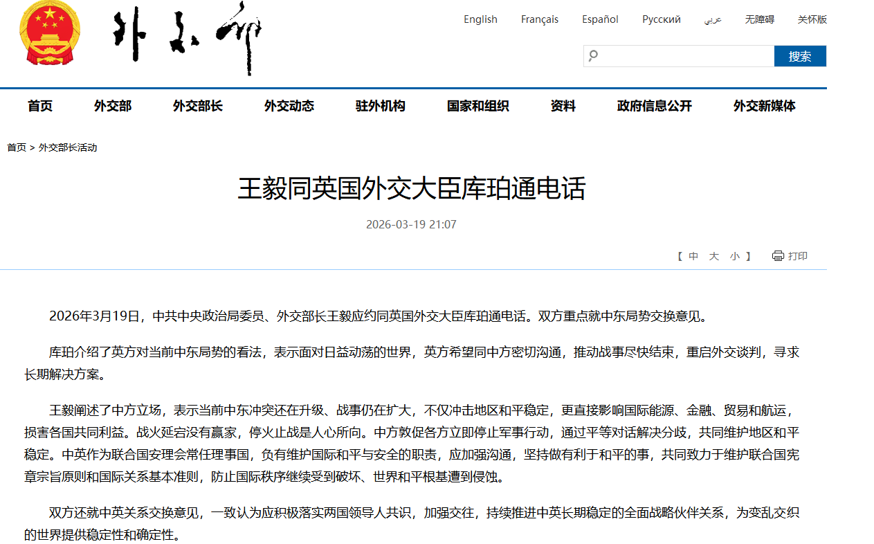 2026年3月19日,中共中央政治局委员、外交部长王毅应约同英国外交大臣库珀通电话。双方重点就中东局势交换意见。