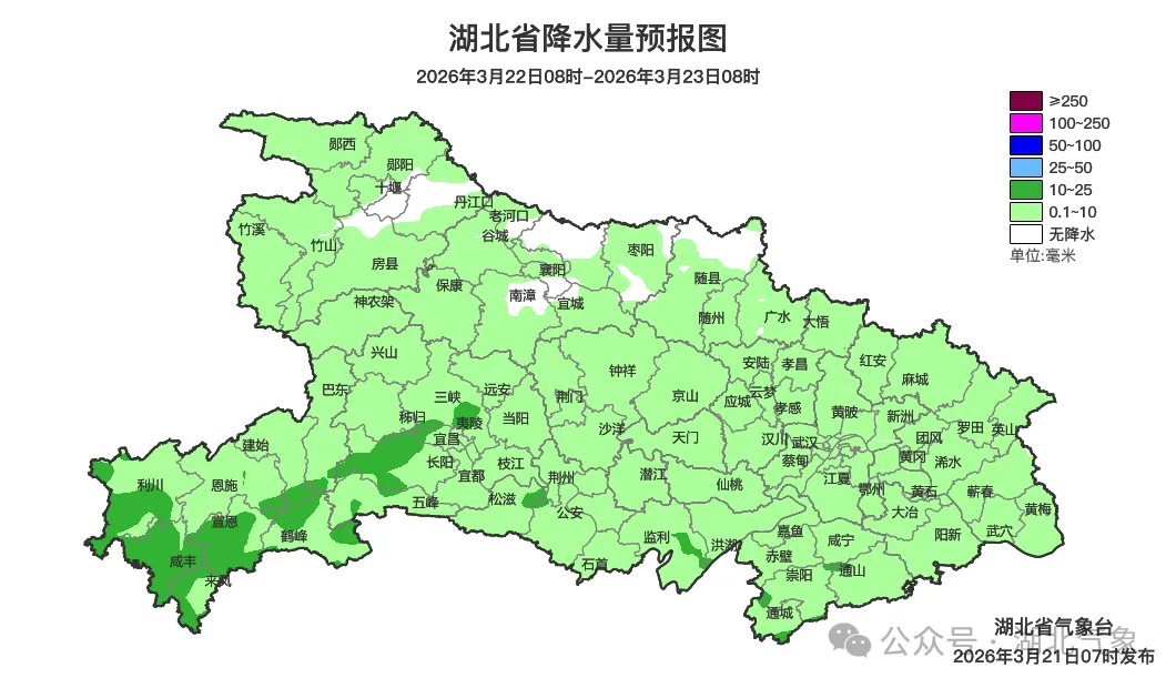 3月22日08时-23日08时,全省多云到阴天,夜间转小雨,其中鄂西南、江汉平原南部、鄂东南南部局地中雨。最高气温鄂西南17~21℃、其他地区21~24℃,最低气温9~13℃,偏北风2到3级。
