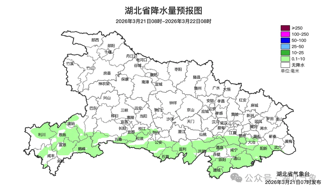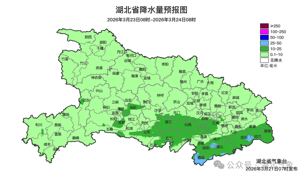 3月23日08时-24日08时,鄂西南、江汉平原南部、鄂东南阴天有小到中雨,局地大雨;其他地区小雨转阴天。最高气温13~18℃,最低气温9~12℃,偏北风3到4级、阵风5到6级。