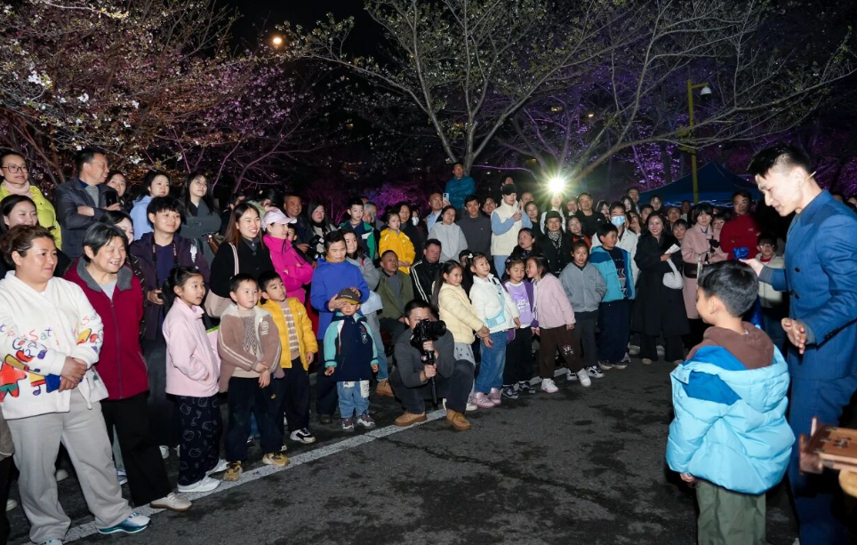 “这个戏法好神奇,空手就能变出东西,还和樱花呼应上了,看得太入迷了!”市民张女士凑在台前,眼神里满是赞叹。