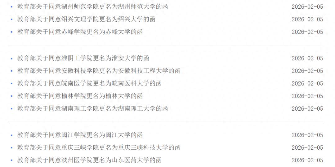 湖州师范学院更名为湖州师范大学,绍兴文理学院更名为绍兴大学,赤峰学院更名为赤峰大学,淮阴工学院更名为淮安大学,安徽科技学院更名为安徽科技工程大学,皖南医学院更名为皖南医科大学,榆林学院更名为榆林大学,湖南理工学院更名为湖南理工大学,闽江学院更名为闽江大学,重庆三峡学院更名为重庆三峡科技大学,滨州医学院更名为山东医药大学。