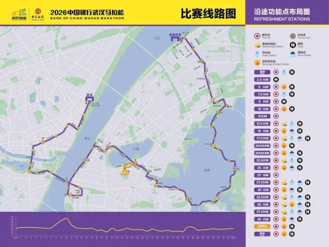 今年的武汉马拉松,赛道全新升级,首次实现武汉7个中心城区全覆盖。赛事起点依旧在沿江大道三阳路口,半马终点回归书卷路,全马终点由武汉欢乐谷全新调整到了青山江滩,这也是青山区首次纳入汉马赛道版图。
