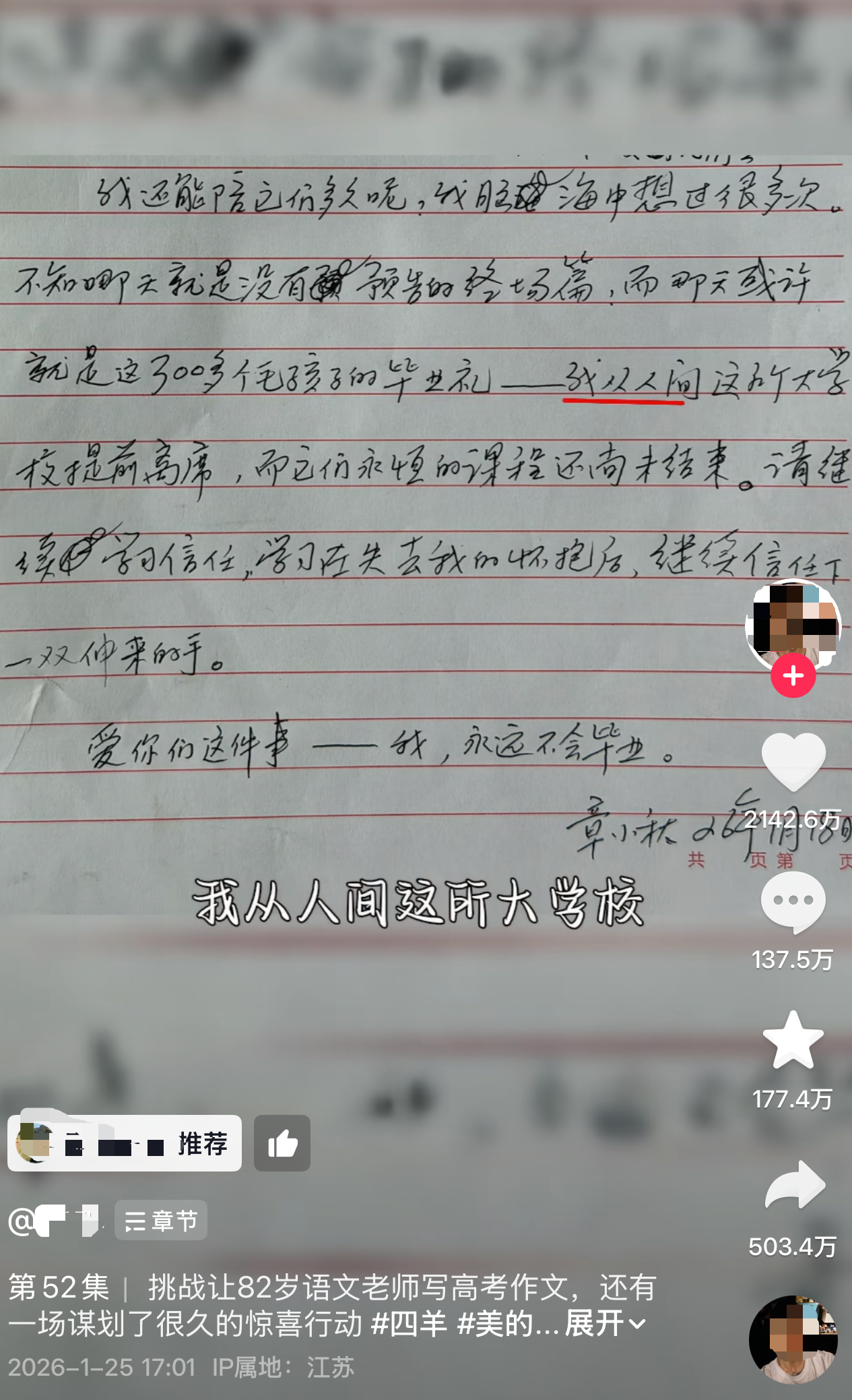 今年1月底,一位短视频博主记录下马鞍山市82岁的退休语文教师章小秋——网友口中的“小秋老师”——一篇题为《毕业前的最后一课》的作文,让无数人为之动容。一场关于爱与守护的故事,就这样悄悄走进了大众的视野。