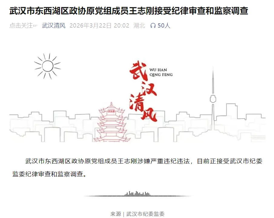 武汉市纪委监委3月22日通报:武汉市东西湖区政协原党组成员王志刚涉嫌严重违纪违法,目前正接受武汉市纪委监委纪律审查和监察调查。