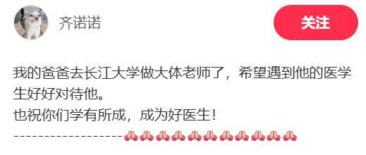 那天,她在车里待了很长一段时间,将内心独白写在社交平台上,“我的爸爸去长江大学做大体老师了,希望遇到他的医学生好好对待他。也祝你们学有所成,成为好医生!”