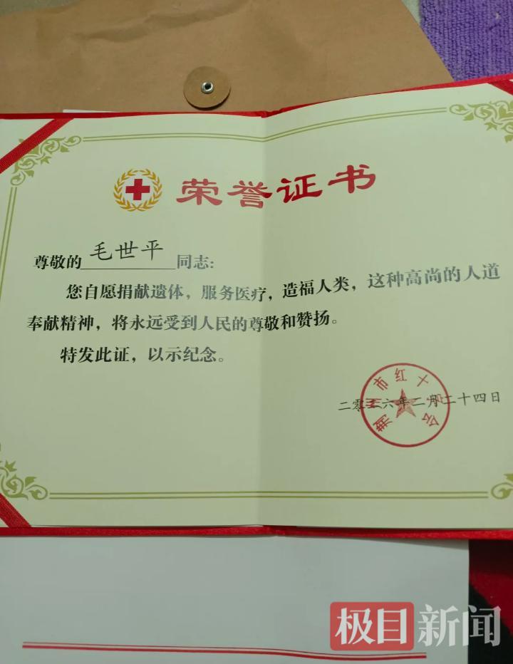 荆州市红十字会颁发的毛世平遗体捐献荣誉证书。(受访者供图)