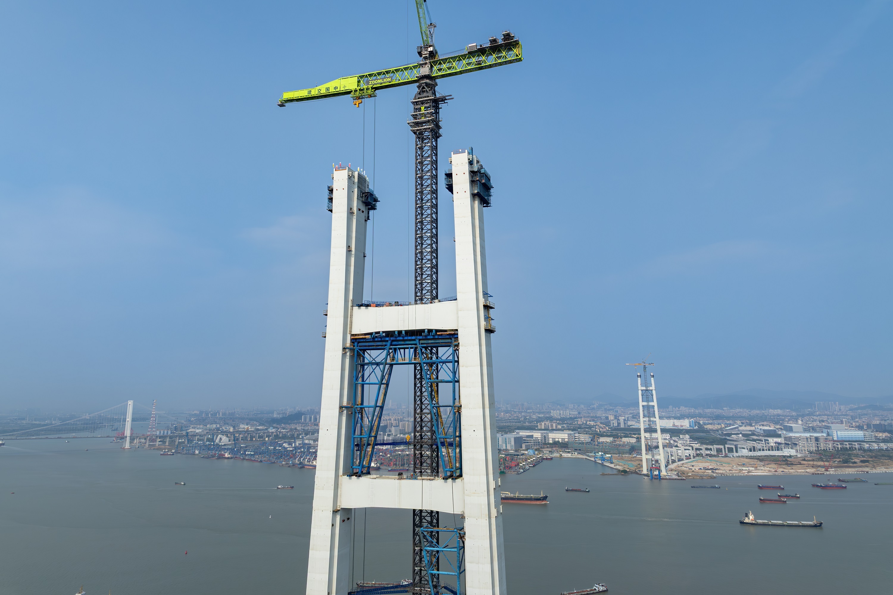 狮子洋大桥设东、西主塔,每座主塔高342米,相当于110层楼高,设6道横梁,单幅塔肢由62个巨型钢壳节段精准拼装。项目创新应用钢板-混凝土组合结构,显著减少塔身自重和提升结构稳定性。