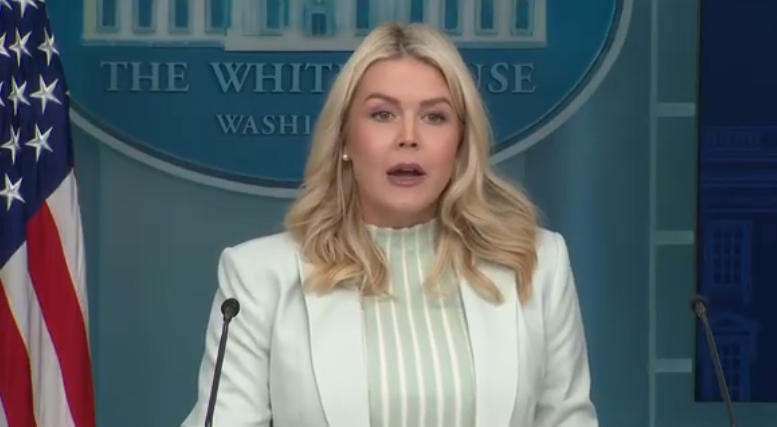 △25日,白宫新闻秘书莱维特举行新闻发布会。