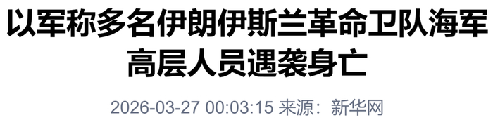 以色列国防军26日发表声明说,以军前一晚对伊朗南部阿巴斯港实施空袭,包括伊朗伊斯兰革命卫队海军司令阿里礼萨·坦格西里及海军情报局局长贝赫纳姆·雷扎伊在内的多名伊朗伊斯兰革命卫队海军高层人员身亡。