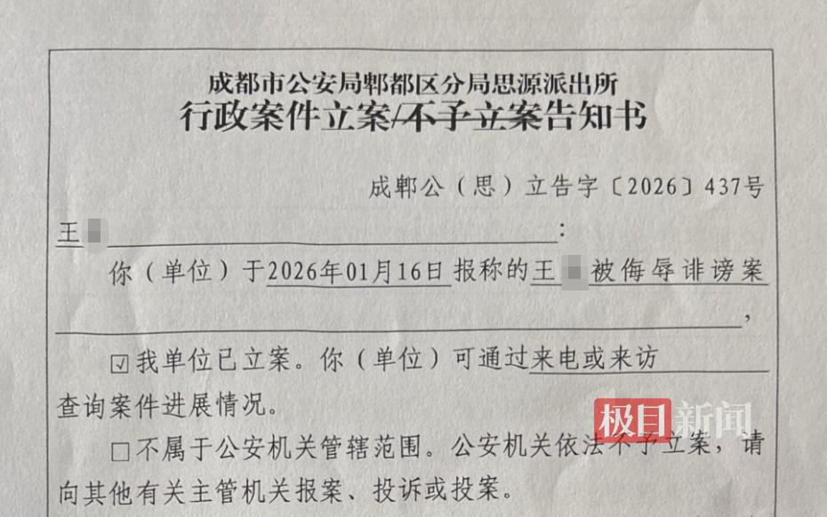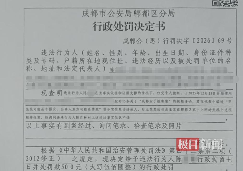 成都市公安局郫都区分局思源派出所出具的立案告知书显示,王女士于2026年1月16日报称的“王*被侮辱诽谤案”,该单位已立案。另外一份成都市公安局郫都区分局2026年1月20日作出的行政处罚决定书显示,违法行为人陈某某在无事实依据和证据支撑的情况下,仅凭个人臆断,于2025年12月23日开始发布15条关于“成都女子被害案”的视频评论。其在视频中编造“王某某可能是个捞女、当事人双方可能系情敌”等不实信息诽谤他人,后王某某的母亲王某在郫都区家中上网时发现上述视频并报案。陈某某被处以行政拘留7日并处罚金500元的行政处罚。