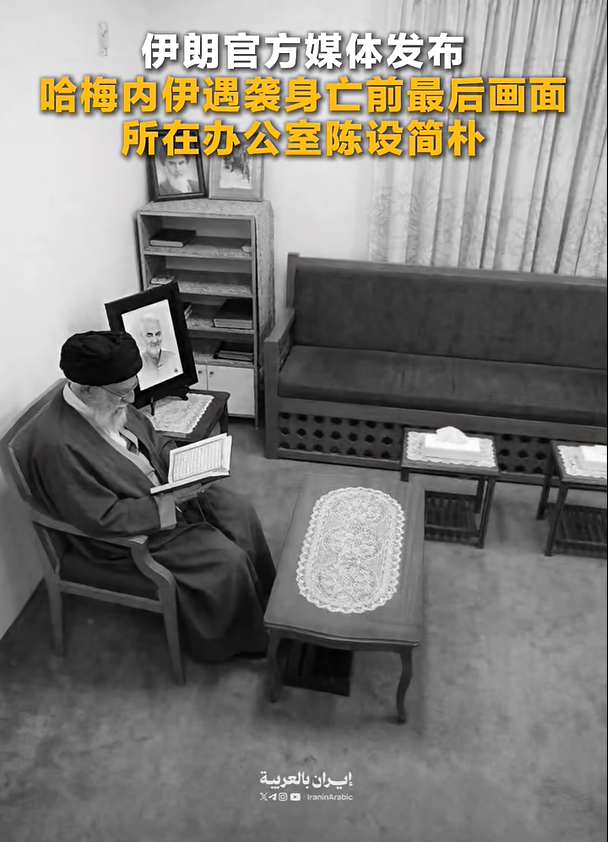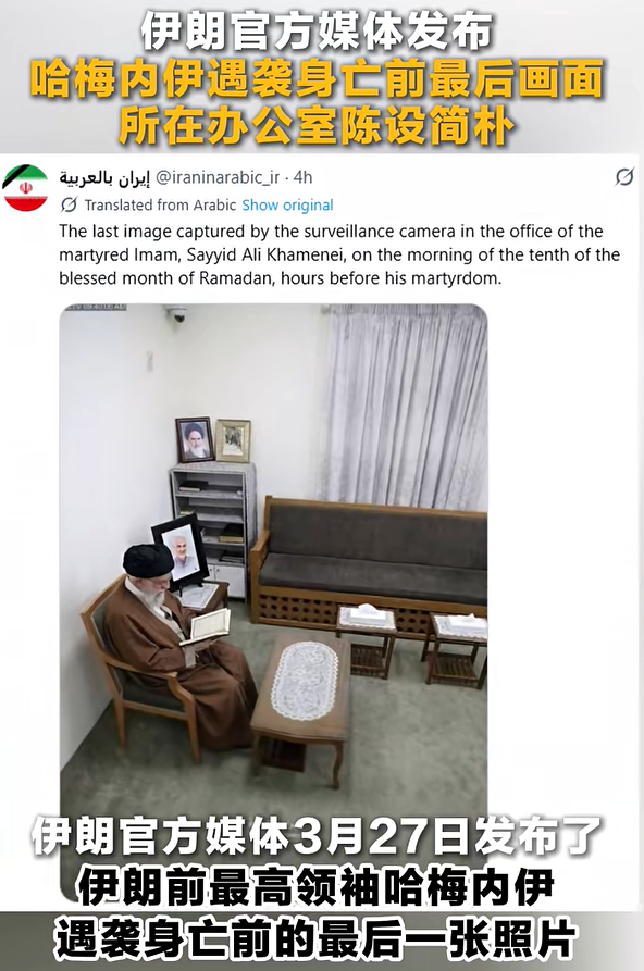 伊朗官方媒体3月27日发布了伊朗前最高领袖哈梅内伊遇袭身亡前的最后一张照片,报道称,这是哈梅内伊遇难前几个小时,其办公室的监控摄像头所拍摄。