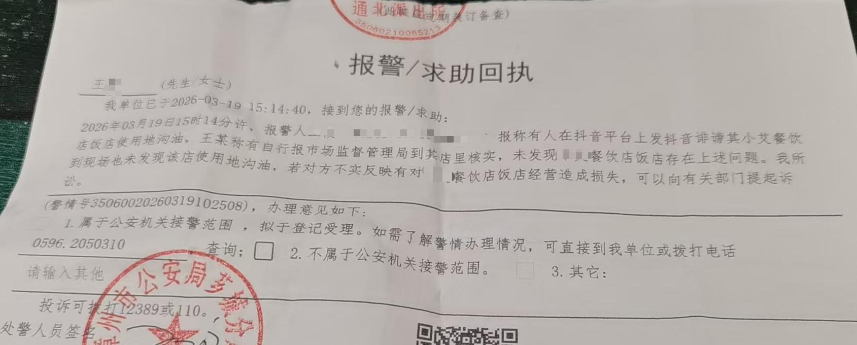 饭店提供的3月19日的报警回执。(来源/受访者供图)