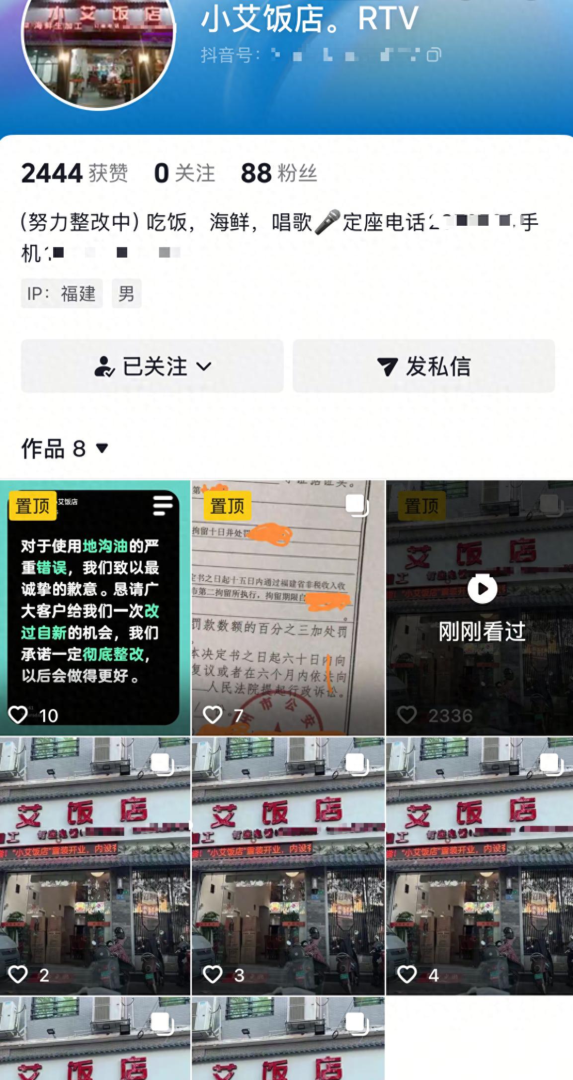 截至3月27日14时,上述账号共发布8条相关视频,首条视频发布于3月26日15时39分,配文是“今日315查出漳州南坑北路小艾饭店使用地沟油事件,已经对该饭店做出罚款,停业整改的处罚,生意越不好做,商家就越不能偷工减料,投机取巧。”视频发布了一张饭店门头照片及三张有人疑在捞取地沟油和身穿制服人员疑似现场执法的相片。账号的置顶视频则是“道歉信”,称对使用地沟的严重错误,致以最诚挚的歉意,希望给予改过自新的机会,承诺一定彻底整改。