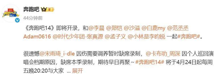 据悉,《奔跑吧14》于3月26日在海南海口观澜湖电影公社开启首轮录制。成员有李晨、郑恺、沙溢、白鹿、范丞丞、时代少年团-张真源、孟子义、李昀锐。陈哲远、黄子弘凡作为飞行嘉宾亮相首日录制。
